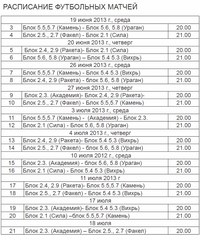 13 июня в Академическом торжественно открыли уже вторую районную спартакиаду. Всё лето жители микрорайона будут соревноваться в трёх видах спорта: футбол, волейбол и шахматы. Первыми пройдут соревнования по футболу. Матчи будут проходить каждую среду и четверг до 18 июля включительно, после начнутся игры по волейболу. Начали с футбола В каждой команде – 5 футболистов. Команды (всего их 7) формировались управдомами. Матчи будут проходить в манеже рядом с домом по улице Краснолесья, 123. Каждый матч длится 40 минут (это 2 тайма). Судить команды будут по всей строгости. За любое нарушение правил игры, игроков будут штрафовать, как и положено, цветными карточками. Запланирован 21 матч 13 июня открыли спартакиаду команды «Академия» и «Сила». У каждой – своя форма: синие и красные майки. Футболисты устроили на поле настоящую борьбу. Уже в первом тайме в воротах «Академии» оказался первый мяч: «Хорошо, что у нас спортивные игры проходят. Летом хотя бы есть чем заняться. Когда узнал о соревнованиях по футболу, сразу решил участвовать», - рассказывает один из участников спартакиады. Итоги соревнований будут подведены в конце августа на закрытии спартакиады, после того, как все команды сыграют между собой. Анна ИСАЕВА