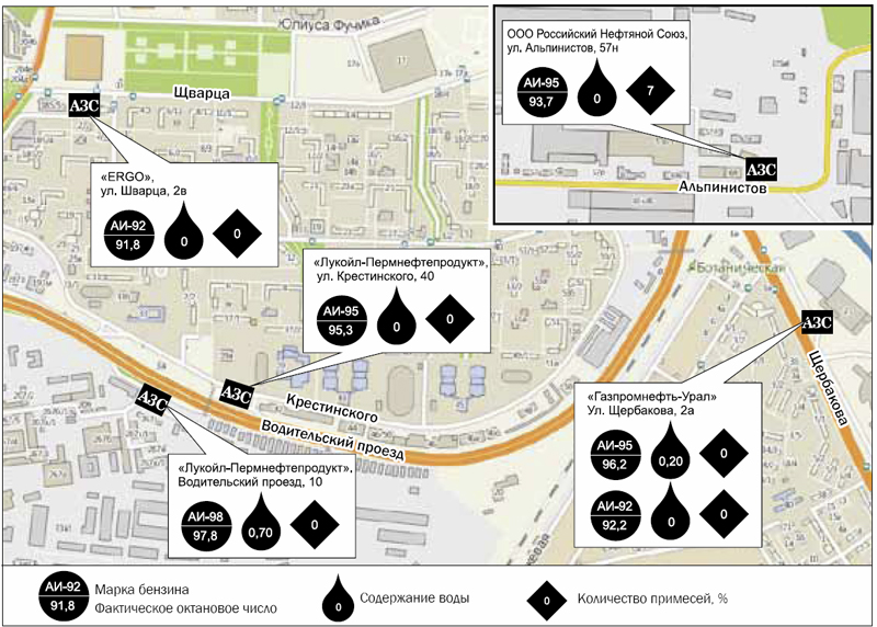 Покупая себе железного коня, мы автоматически приобретаем и головную боль – где, как и сколько его кормить. Споры о том, бензин какой компании «чище» и «лучше», среди автомобилистов ходят давно. Именно для того, чтобы наконец понять, на каких бензоколонках в районе топливо стоит своих денег, журналисты портала www.66.ru вышли на рейд по заправочным станциям вместе с мобильной лабораторией В роли объектов для проверки выступали, во-первых, основные представители крупных федеральных сетей «Газпромнефть» и «Лукойл», а во-вторых, мелкие региональные несетевые АЗС. На Химмаше проверили только одну заправочную станцию — ту, которая находится на ул. Альпинистов, 57. Исследовав здесь 95-ый бензин, журналисты узнали, что, во-первых, он обладает заниженным октановым числом, а во-вторых, насыщен смолами. СПРАВКА: Почему нельзя заправляться некачественным бензином? 1. Антидетонационные присадки повышают изначально низкое октановое число; наличие большого числа присадок может способствовать ускоренному износу двигателя и снижению его ресурса. 2. Наличие вредных примесей может привести к образованию нагара на стенках цилиндров и последующей поломке двигателя. 3. Смолы оседают в двигателе, что может привести к техническим неисправностям. 4. Разбавление топлива водой сокращает срок эксплуатации автомобиля, ведет к преждевременному износу двигателя, нарушению работы топливной системы, проблемам со свечами, бензонасосом и т.д. По материалам портала www.66.ru