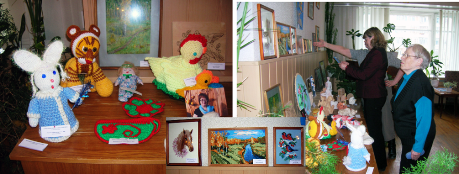фигурки животных, шкатулки, вязанные игрушки и куклы. Все эти работы выполнены инвалидами,