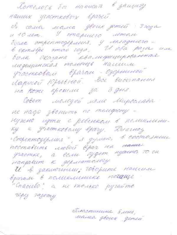 Мама двоих детей, приславшая нам письмо, встала на защиту районных участковых. В своем письме она пишет о том, что ее детям, болевшим стрептодермией, была оказана своевременная и квалифицированная помощь. И советует маме Мирослава не звонить в регистратуру, а приходить с ребенком к врачу – на участке помогут обязательно.