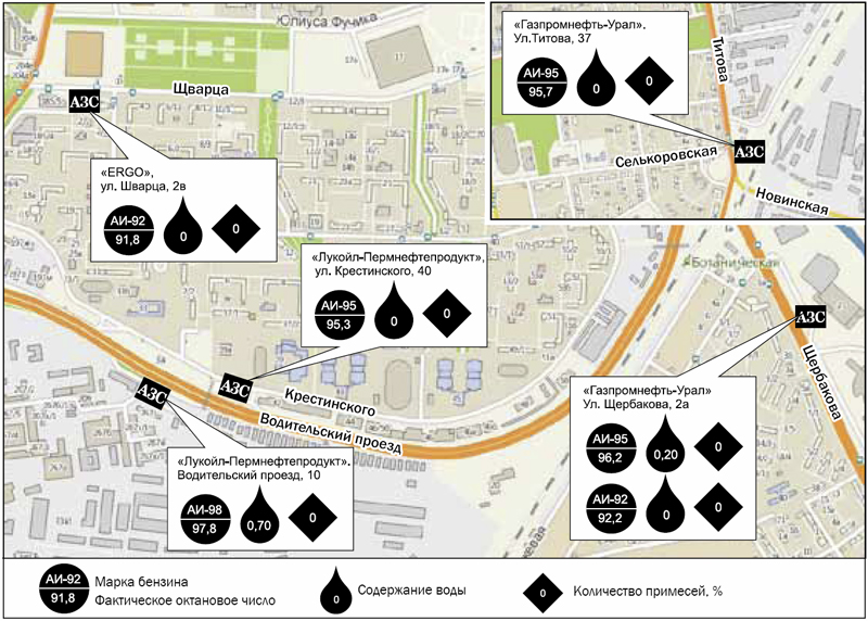 В роли объектов для проверки выступали, во-первых, основные представители крупных федеральных сетей «Газпромнефть» и «Лукойл», а во-вторых, мелкие региональные несетевые АЗС. На Ботанике и Вторчермете проверили 5 заправок – те, что находятся на ул. Крестинского, Титова, Щварца и Щербакова. Проверяли три вида бензина – АИ-92, АИ-95 и АИ-98. Каждая проба бензина исследовалась по ряду параметров, которые помогали выявить, есть ли в бензине повышенное содержание воды и примесей, а также правильно ли указано октановое число топлива.