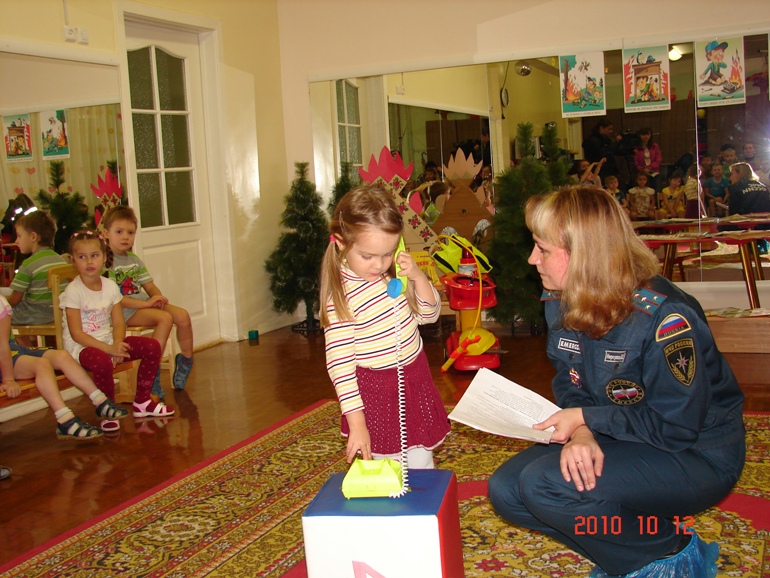 Методист детского сада №563 Бурдова Алла Юрьевна предложила провести для своих воспитанников викторину и учения, тем самым в игровой форме закрепить с детьми основные знания о пожарной безопасности, правила поведения в экстремальных ситуациях. «Именно закрепить, наши ребятишки знают многое об опасности огня!», - уверила меня Алла Юрьевна. Дети дружно отгадывали загадки об огне и воде; «вызывали» пожарных по телефону, сообщая всю необходимую информацию; гуськом, закрыв рот и нос, передвигались к выходу, «защищая» себя от дыма. Но каково же было мое удивление, когда пяти – шестилетние малыши доказательно отвечали, какая елка, живая или искусственная, опаснее для человека при горении, или, почему нельзя прикасаться к электроприборам мокрыми руками!
