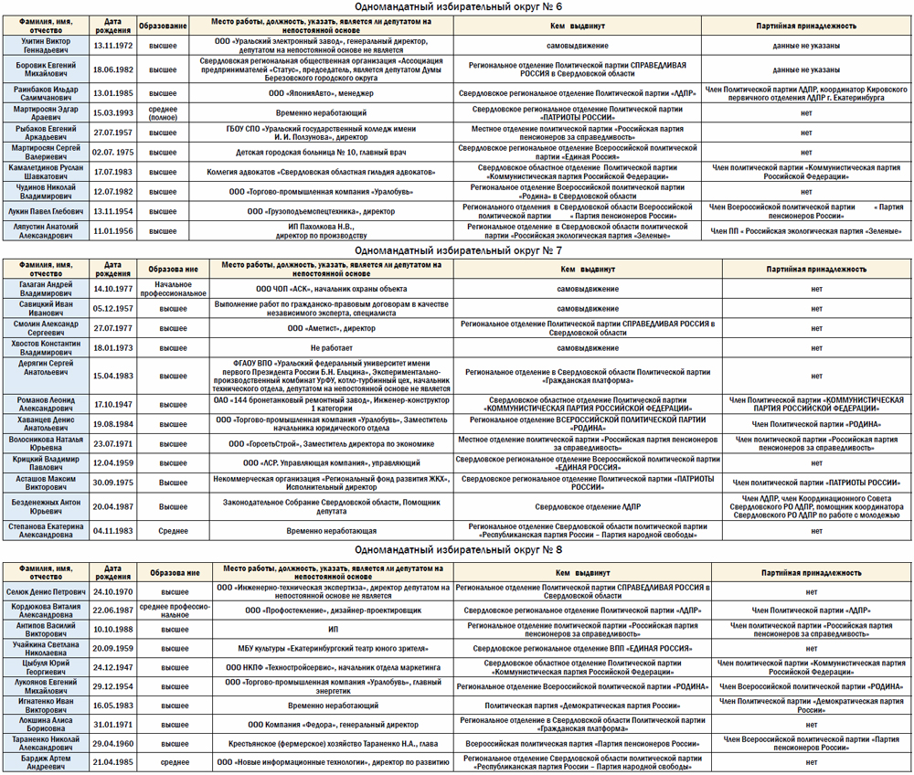 В среду, 24 июля, завершилось выдвижение кандидатов на пост главы Екатеринбурга и кандидатов в депутаты гордумы. Напомним, выборы состоятся 8 сентября. Стать главой города на текущий момент изъявили желание 18 кандидатов. По данным екатеринбургской избирательной комиссии, пятеро из них - депутат госдумы РФ Александр Бурков («Справедливая Россия»), советник президента ЗАО «Дэнас МС» Александр Рявкин («Гражданская сила»), адвокат Герман Карелин («Демократическая партия России»), специалист по связям с общественностью Анастасия Бакова («Монархическая партия»), депутат законодательного собрания Свердловской области Денис Носков (ЛДПР) – уже зарегистрированы в качестве кандидатов. В списке желающих занять пост главы Екатеринбурга также значатся: В горизбиркоме сообщили, что в списке претендентов на должность градоначальника появился еще один Александр Бурков, тезка «справедливоросса»: он – представитель «Коммунистической партии социальной справедливости». Также определился круг кандидатов в депутаты. Ниже вы можете изучить список кандидатов по округу, относящемуся к нашему микрорайону. Этот список, как и список кандидатов в мэры может уменьшиться, так как в ближайшее время будет проверяться вся информация, предоставленная политиками. Копии документов избирательная комиссия отдаст в налоговую, в регистрационную службу, в БТИ – они будут подтверждать их достоверность. Контроль будет не строгий, например, неверные сведения об имуществе не будут являться основанием для снятия с выборов. Например, если человек купил машину и не указал ее в документах, об этом просто сообщат избирателям дополнительно. Другое дело, если кандидат не сказал об имеющейся судимости или наличии гражданства другого государства. Это уже основания для снятия кандидатуры с выборов. Отметим, что ниже представлен неполный список. Дополнительно мы будем выбирать депутата по партийным спискам. Каждая партия выдвинула на выборы трех своих кандидатов.